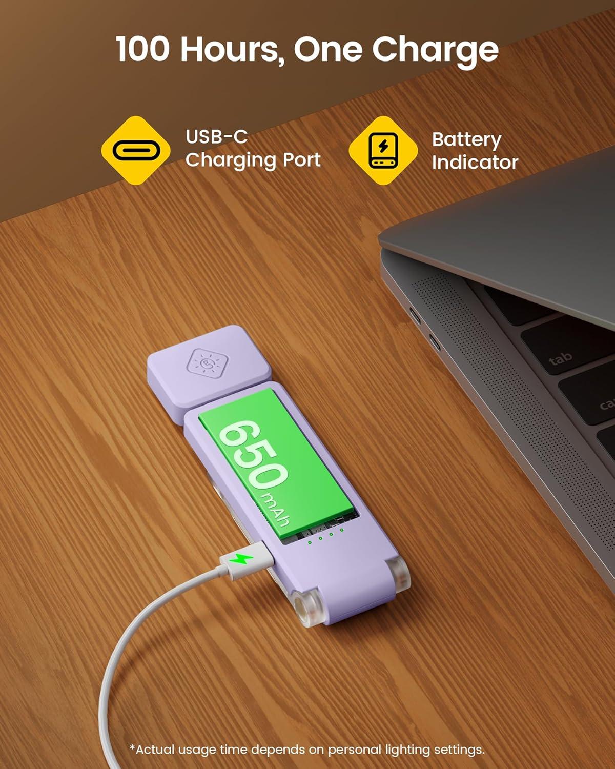 [650mAh Battery for Extended Runtime] The built-in 650mAh battery provides up to 100 hrs of light. This means you can enjoy up to 6 months of reading on a single charge if you read for 30 minutes daily with our reading light for bed. No more constant charging interruptions. This rechargeable book light with 4 clear power indicators let you check the battery level at a glance and say goodbye to battery anxiety.